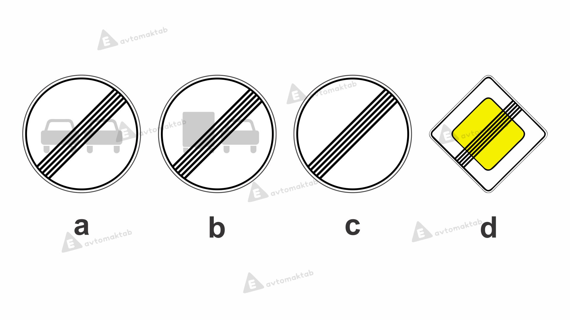 Ko‘rsatilgan yo‘l belgilaridan qaysi biri taqiqlovchi belgilar kiritgan barcha cheklovlarni bekor qiladi?